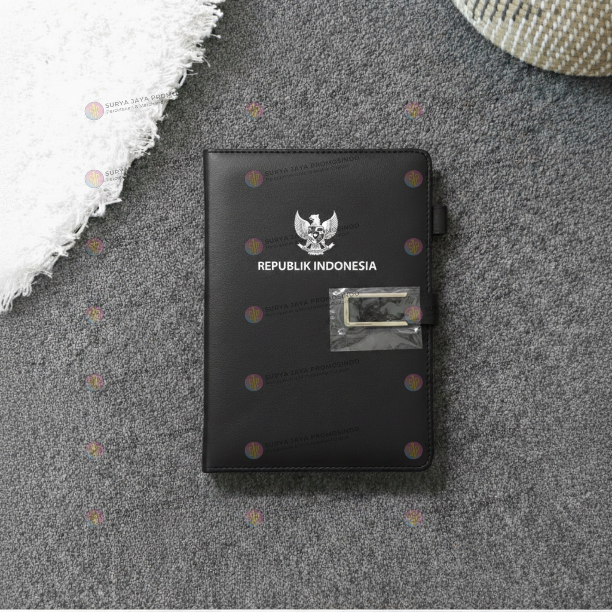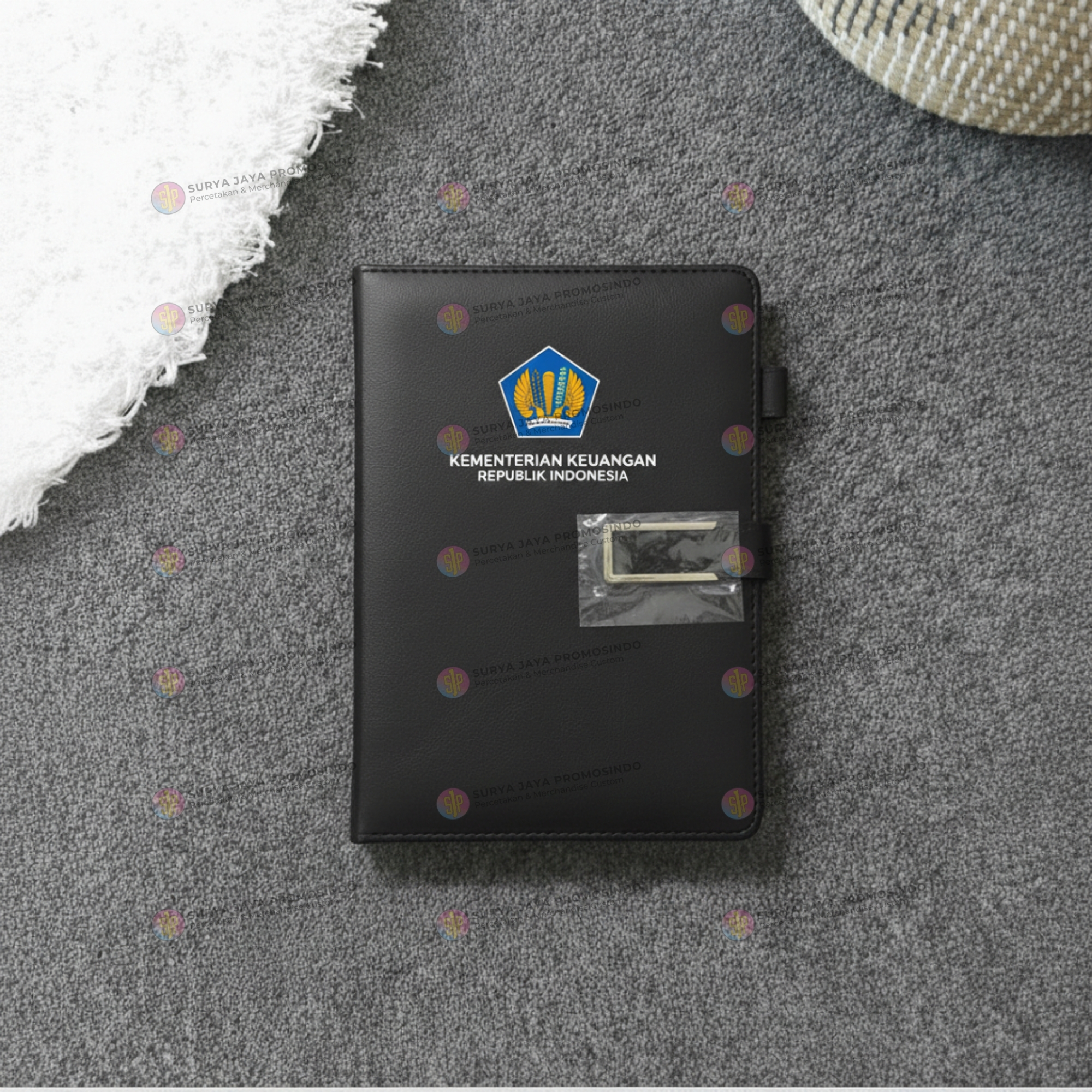 Menggunakan bahan cover kulit kain premium, agenda ini tampil elegan dan berkelas. Sistem tutup magnet memberikan keamanan sekaligus kesan modern. Logo perusahaan dicetak menggunakan teknik Print UV, menghasilkan warna yang tajam, presisi, dan tahan lama.